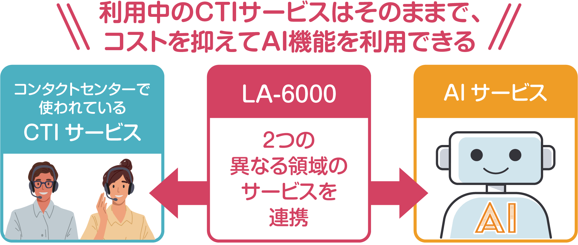 しかし「LA-6000」を使用することで、お客様はご利用中のCTIサービスをそのまま活用し、必要なAIサービスを柔軟に連携させ、その機能を利用することができます。これにより、CTIサービスの変更や刷新が不要となるため、無駄な費用や手間を省くことが可能となります。