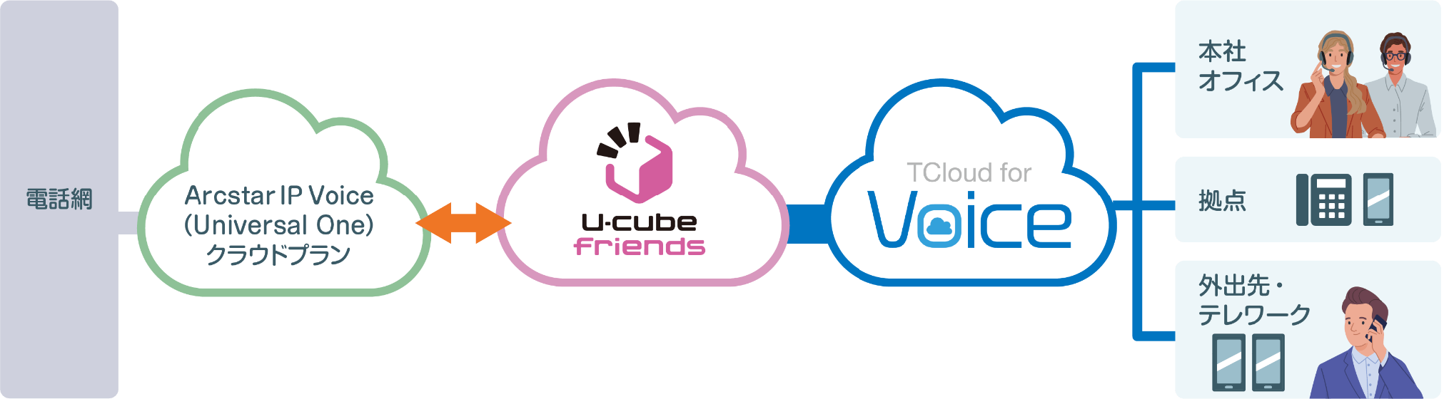 当社のパートナーである都築電気株式会社においても、同社が提供するクラウドPBX「TCloud for Voice ※4」において、「U-cube friends」と「Arcstar IP Voice」を活用したフルクラウド電話システムの構築・提供が可能です。従来は各拠点ごとに必要だった電話回線の敷設や設備設置が不要となり、完全なクラウド環境での音声通話サービスを提供いたします。
